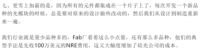 回答:與文章總結(jié)觀點恰恰相反,硅光技術(shù)和工藝能力在過去幾年來的發(fā)展速度非常快,不論是來自客戶端的明確需求,還是Fab的強力支持,400G和800G硅光模塊產(chǎn)品和供應(yīng)鏈都已經(jīng)完全成熟。目前國際上幾乎所有的Fab,包括TSMC、Global Foundry、UMC、Tower Jazz、SMIC、ST等都能夠提供硅光研發(fā)和流片服務(wù),硅光的各類測試設(shè)備也都已經(jīng)出現(xiàn)了專業(yè)的供應(yīng)商。什么后臺很硬的Intel這種江湖論調(diào),什么命數(shù),硅光的機遇不是文章提到的這些點,而正是客戶需求和成本契合這一拐點的出現(xiàn)。