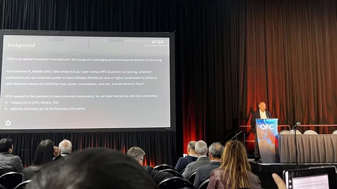 在OFC活動(dòng)期間,華拓首席科學(xué)家Toshi K. Uchida博士發(fā)表了The Road to 200G per Lane技術(shù)演講,深入探討了ATOP在開發(fā)單通道200G硅光產(chǎn)品方面的技術(shù)實(shí)踐,包括過頻率ADP IC如何在人工智能應(yīng)用中實(shí)現(xiàn)更高的數(shù)據(jù)傳輸速率,同時(shí)降低延遲、功耗和成本。