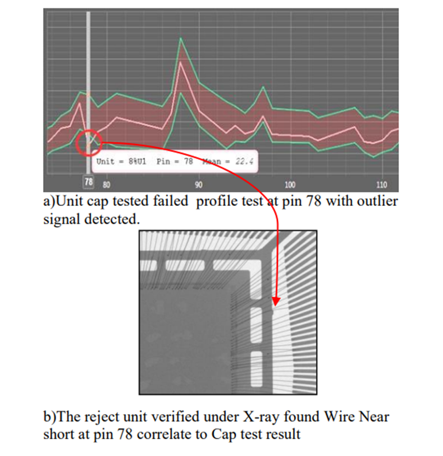 基于電容的測試技術成功應對了這兩項挑戰(zhàn)。這一先進技術能夠檢測到那些傳統(tǒng) ATE 和 X 射線系統(tǒng)難以察覺的缺陷,例如鍵合線和內(nèi)部引線之間的 “近似短路 ”以及垂直方向上的導線下垂問題。此外,它還能識別出芯片錯誤和模塑化合物問題等其他方面的異常,進而顯著提升了其診斷能力。