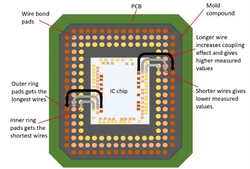 然而,隨著技術的不斷進步以及集成電路復雜性的日益提升,一系列更先進的封裝類型應運而生,其中包括球柵陣列 (BGA),此類封裝涉及多層鍵合線的堆疊。如下圖 4 所示,由于鍵合線排列的復雜性顯著增加,所以這種先進的方法為測量電容耦合信號帶來了更多的挑戰(zhàn)。