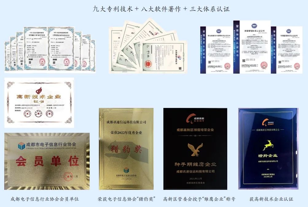 訊速信遠自成立以來,年銷售額增長率超過了50%,2021年被成都市高新區(qū)授予“雛鷹”計劃企業(yè),2023年實現(xiàn)新增合同額突破1億元,通過高新企業(yè)認證和ISO三大管理體系認證,并入選“高新區(qū)瞪羚企業(yè)”,截至2024年10月總銷售額超4億元。