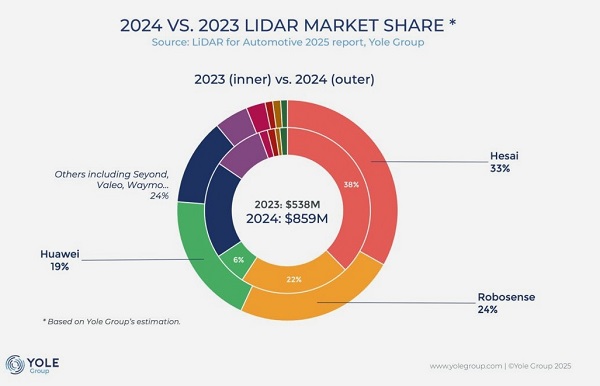 Yole集團發(fā)布的《2025年汽車激光雷達》報告通過多項關鍵指標對激光雷達企業(yè)進行排名,指出禾賽2024年以33%的營收占比領跑全球市場。該市場規(guī)模同比增長60%,達到8.59億美元。