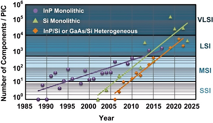 圖:各類光芯片的單片集成規(guī)模趨勢