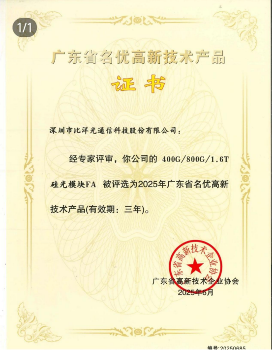 ICC訊 近日,ICC訊石借CUBE-Net 2025在北京舉辦之機,走訪了在安徽合肥的比洋通信,拜訪了比洋通信董事長陳享郭先生,以及比洋通信總監(jiān)汪洋。陳總、汪總向ICC訊石詳細介紹了比洋通信近些年來在安徽合肥巢湖經(jīng)濟開發(fā)區(qū)的發(fā)展情況,同時恰逢近期2025 年廣東省名優(yōu)高新技術產(chǎn)品評選結果揭曉,比洋通信憑借強大的自主研發(fā)實力,其自主打造的 800G/1.6T 高速光模塊 MT-mini MT 和 400G/800G/1.6T 硅光模塊 FA 兩款產(chǎn)品,憑借領先行業(yè)的技術水平與卓越穩(wěn)定的產(chǎn)品性能,成功斬獲此項榮譽。