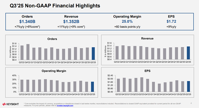 ICC訊 是德科技(Keysight Technologies, Inc.,紐約證券交易所代碼:KEYS)近日公布了2025財(cái)年第三季度(截至2025年7月31日)財(cái)務(wù)業(yè)績(jī)。公司本季度表現(xiàn)強(qiáng)勁,營(yíng)收和每股收益均超過(guò)指引范圍的高端,并基于良好的執(zhí)行力和第四季度的強(qiáng)勁訂單儲(chǔ)備,再度上調(diào)了全年業(yè)績(jī)展望。
