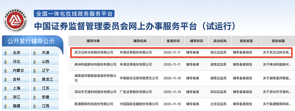 ICC訊 11月11日,證監(jiān)會(huì)官網(wǎng)披露,湖北武漢光通信芯片企業(yè)云嶺光電在湖北證監(jiān)局辦理輔導(dǎo)備案登記,啟動(dòng)北交所上市輔導(dǎo),向資本市場(chǎng)邁出關(guān)鍵一步。