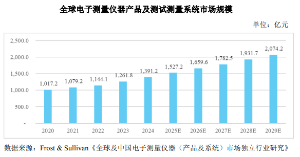 根據(jù)行業(yè)預(yù)測,全球電子測量儀器產(chǎn)品及測試測量系統(tǒng)市場規(guī)模預(yù)計將從2025年的 1,527.2億元 增長至2029年的 2,074.2億元,年均復(fù)合增長率約 7.95%。隨著國內(nèi)政策支持力度加大、下游市場需求持續(xù)釋放以及國產(chǎn)替代進程加速,中國電子測量儀器市場有望迎來更高速度增長。
