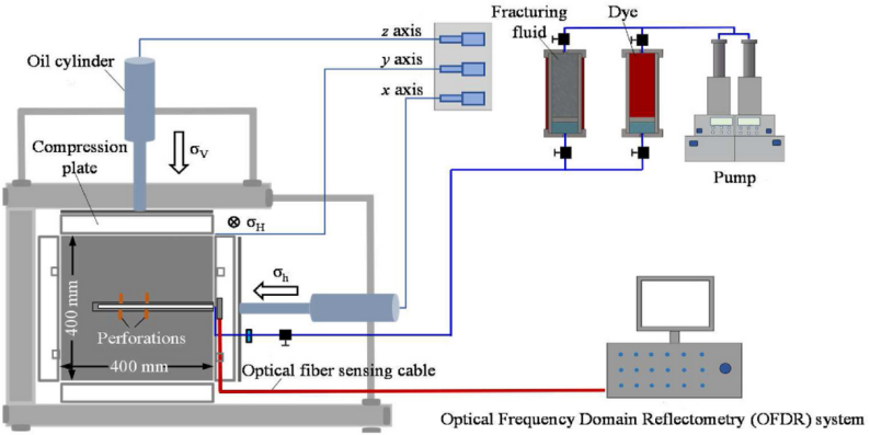 采用大型真三軸壓裂物理模擬系統(tǒng),核心組件包括真三軸模型框架、高壓缸、液壓動力泵組、數(shù)據(jù)采集系統(tǒng)及OFDR光纖監(jiān)測系統(tǒng)。OFDR光纖監(jiān)測系統(tǒng)為昊衡科技的OSI-D設(shè)備,進行分布式傳感光纖數(shù)據(jù)采集,其間分辨率能達到1.28mm,應(yīng)變測量精度1με,最大采樣率120Hz。