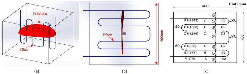實驗樣品采用定制化整體澆鑄工藝,尺寸為400mm×400mm×400mm,由油井水泥和石英砂按2:5體積比混合制成,固化28天后獲得高強度、低滲透率樣品。光纖以“弓形”纏繞在金屬絲上,用棉線固定并點涂光纖膠水形成組件,通過拼接尾端反射消除器提升信號質(zhì)量,嵌入樣品指定高度,兩端延伸至模具外用于連接跳線。設(shè)置兩種監(jiān)測場景:裂縫與光纖垂直接觸時模擬相鄰水平井監(jiān)測,裂縫與光纖平行時模擬相鄰垂直井監(jiān)測。