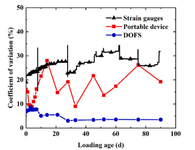 蠕變?cè)囼?yàn)中,OFDR測(cè)量的變異系數(shù)(CV)均值僅5.60%,較應(yīng)變片(23.22%)降低76%,較便攜式應(yīng)變儀(16.07%)降低65%;收縮試驗(yàn)中其CV穩(wěn)定在8.68%-11.60%,曲線增長趨勢(shì)平穩(wěn),數(shù)據(jù)離散性顯著低于傳統(tǒng)方法。