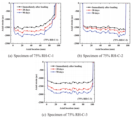 制備超高強(qiáng)海砂混凝土圓柱試件(φ75mm×150mm,用于蠕變?cè)囼?yàn))和棱柱體試件(75mm×75mm×285mm,用于收縮試驗(yàn)),經(jīng)90℃蒸汽養(yǎng)護(hù)24h;試驗(yàn)設(shè)置50%RH、75%RH及密封三種濕度環(huán)境,制定間歇測(cè)量方案:蠕變?cè)囼?yàn)加載前后各測(cè)1次,加載后1-7天日測(cè),后續(xù)于第10、14、21等關(guān)鍵節(jié)點(diǎn)測(cè)量,總周期90天;收縮試驗(yàn)1-7天日測(cè),后續(xù)關(guān)鍵節(jié)點(diǎn)測(cè)量,總周期52天。