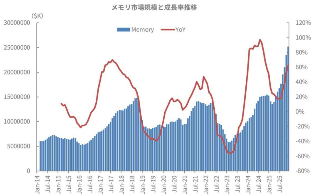 如上圖所示,根據(jù)以往的模式,存儲器市場增長率呈現(xiàn)四年周期性波動,在2017年中期達到峰值,2019年中期觸底,2021年下半年再次達到峰值,2023年中期觸底。按照這種模式,人們可能會預(yù)期峰值出現(xiàn)在2025年,谷底出現(xiàn)在2027年。