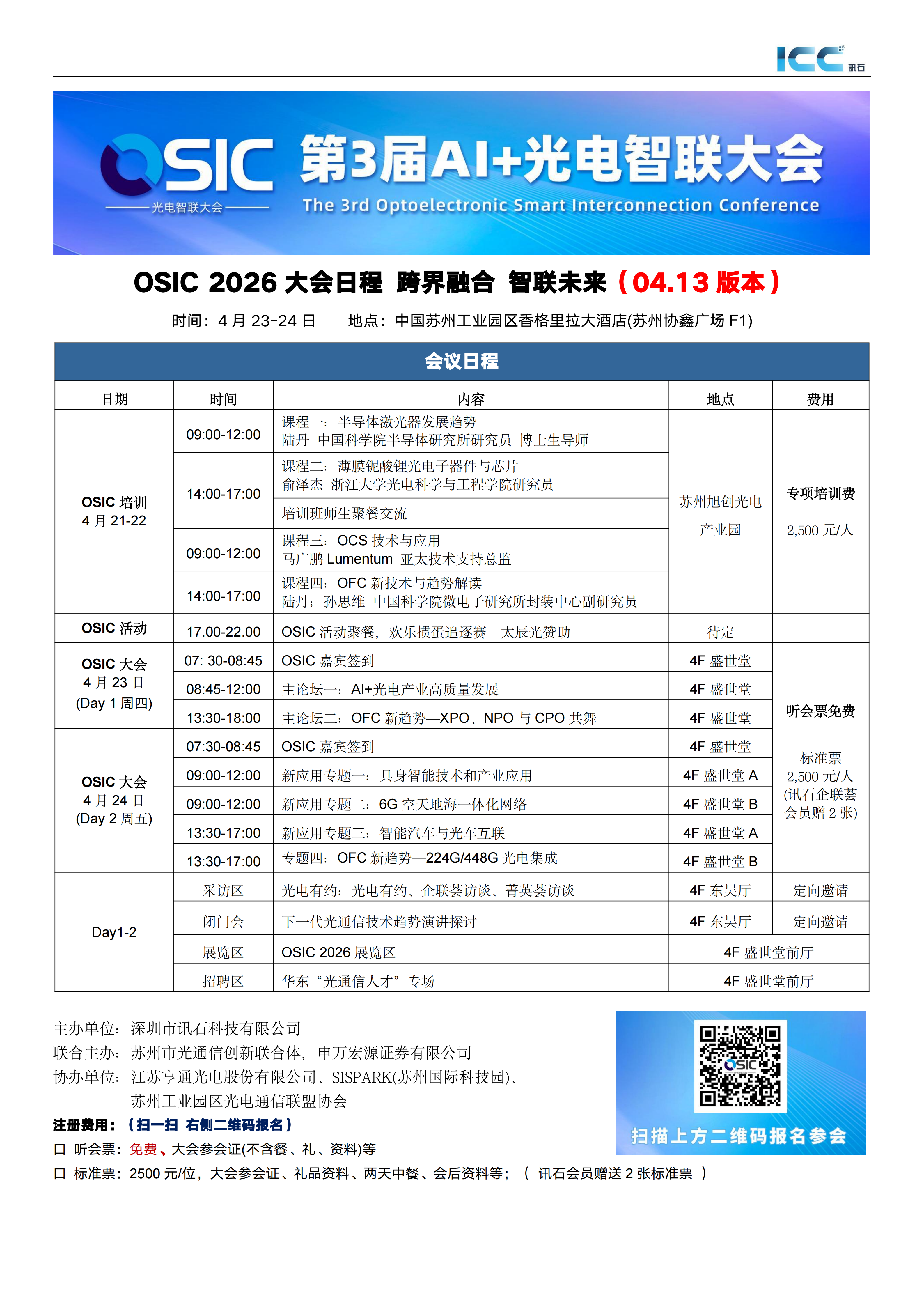ICC訊 4 月 23–24 日 OSIC 2026 第3屆AI+光電智聯(lián)大會(huì)以“跨界融合?智聯(lián)未來”為主題,深挖OFC新趨勢(shì)、開拓光通信跨界新應(yīng)用,會(huì)議采用2(主論壇)+4(專題論壇)+N(閉門論壇、產(chǎn)品展、人才招聘展、休閑活動(dòng)等)會(huì)議模型,圍繞市場(chǎng)、技術(shù)、資本、人才四大維度展開,以AI算力光互聯(lián)為核心,延伸至6G空天地海一體化、車路云智能網(wǎng)聯(lián)、具身智能互聯(lián)等前沿領(lǐng)域與1500位與會(huì)嘉賓共同討論。