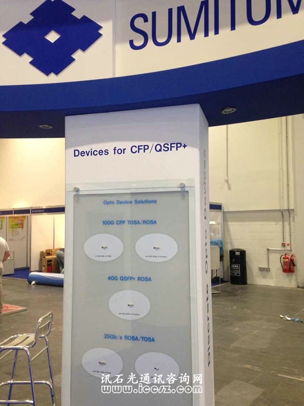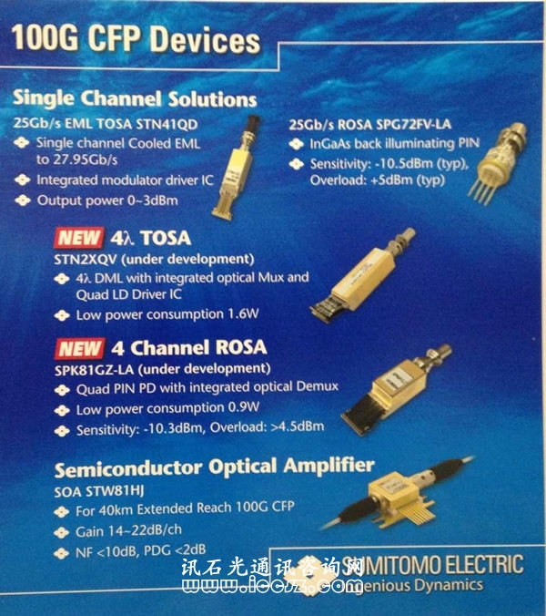 本屆展會上,展出100G相關產(chǎn)品的陣容強大的當屬住友電工無疑了。住友電工的展臺號為404,展品有CFP/QSFP+ 產(chǎn)品涉及100G/40G CFP TOSA/ROSA及模塊,40G QSFP+ROSA及模塊,25Gb/s ROSA/TOSA。