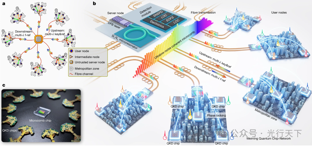 ICC訊 想要實現(xiàn)大規(guī)模量子通信,芯片化集成是關(guān)鍵方向。經(jīng)過六年多技術(shù)攻關(guān),北京大學(xué)王劍威教授、龔旗煌教授與常林研究員團隊研制出兩款核心芯片,成功構(gòu)建全球首個基于集成光量子芯片的大規(guī)模量子密鑰分發(fā)網(wǎng)絡(luò)——“未名量子芯網(wǎng)”。相關(guān)研究成果以《Large-scale quantum communication networks with integrated photonics》為題目,發(fā)在《自然》期刊上。