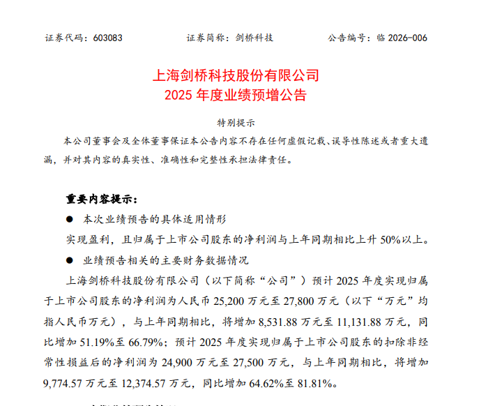 公告顯示,公司預(yù)計(jì)2025年度實(shí)現(xiàn)歸屬于上市公司股東的扣除非經(jīng)常性損益后的凈利潤(rùn)為2.49元至2.75億元,與上年同期相比增加9,774.57萬(wàn)元至1.24億元,同比增幅達(dá)64.62%至81.81%。