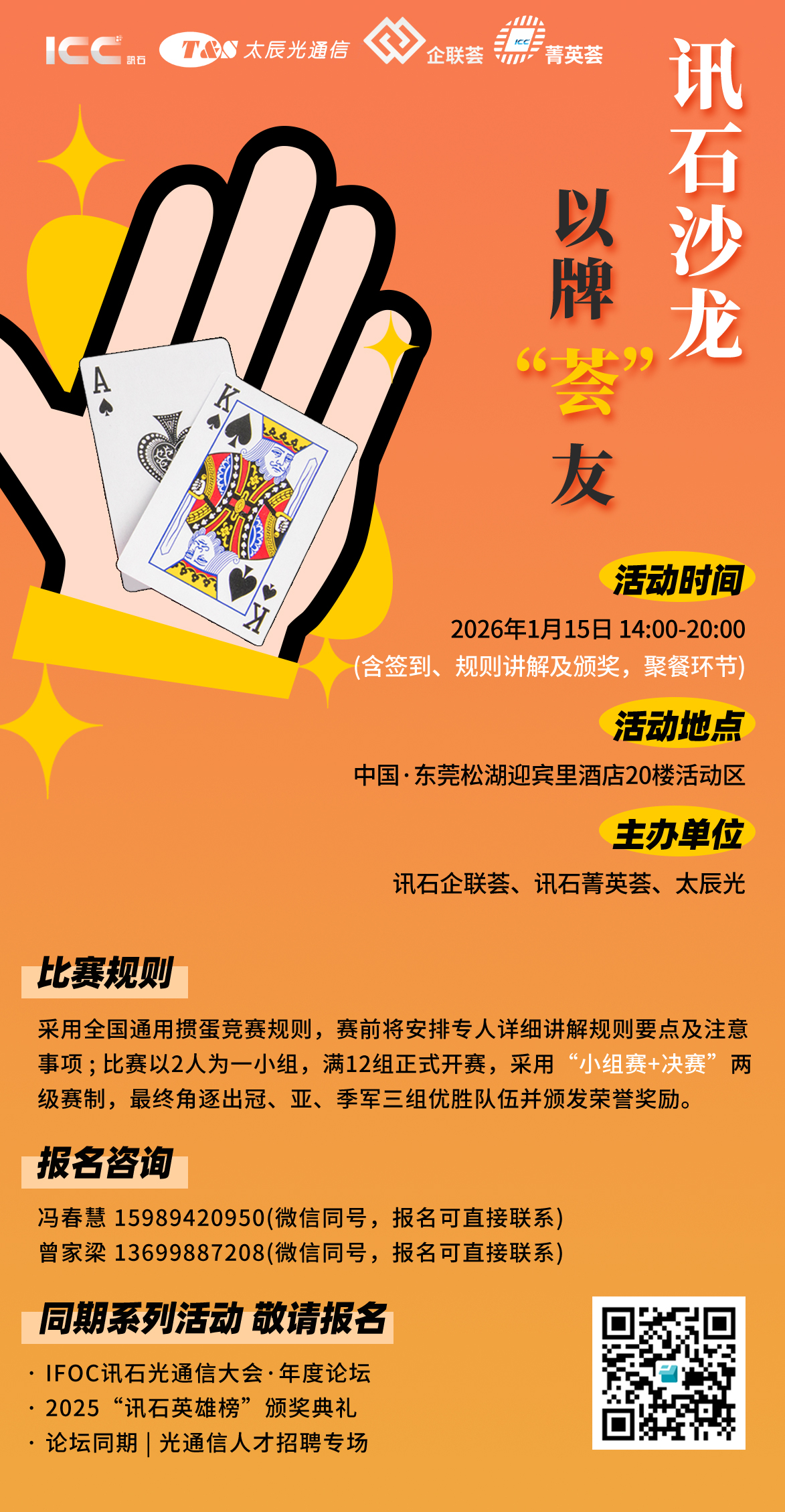 ICC訊 2026年1月16日IFOC訊石光通信大會·年度論壇暨2025“訊石英雄榜”頒獎典禮將在東莞隆重啟幕。為提前搭建行業(yè)交流橋梁,滿足光通信從業(yè)者多元化的連接需求,讓行業(yè)同仁在正式會議前卸下忙碌、輕松破冰,訊石企聯(lián)薈聯(lián)合菁英薈特于大會前夕(1月15日下午)策劃舉辦“訊石沙龍·以牌‘薈’友——光通信摜蛋友誼賽”?;顒右浴皳サ啊边@一全民喜愛的競技娛樂形式為媒介,打造輕松愉悅的沉浸式交流場景,秉持“連接創(chuàng)造價值”的核心,助力行業(yè)同仁締結(jié)友誼、探尋合作契機。活動安排賽后聚餐,歡迎各位行業(yè)同仁報名!