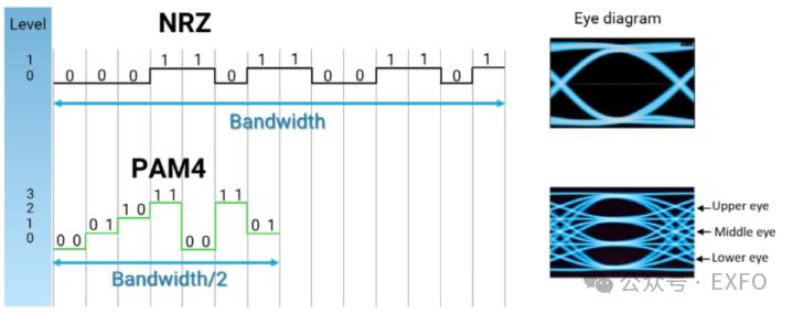 圖1:?NRZ和PAM4二進(jìn)制電平及對(duì)應(yīng)的眼圖。