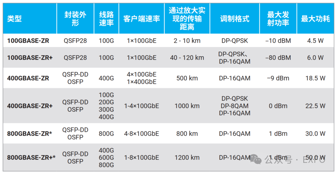 400ZR標(biāo)準(zhǔn)旨在支持高達(dá)80 km的點(diǎn)對(duì)點(diǎn)(P2P)高速光傳輸,而無(wú)需進(jìn)行光放大,使其成為數(shù)據(jù)中心互聯(lián)(DCI)和城域網(wǎng)的理想選擇。在無(wú)放大器的P2P場(chǎng)景中,傳輸距離受信號(hào)丟失、色度色散(CD)和偏振模色散(PMD)等因素限制,這些因素可能導(dǎo)致信號(hào)在更長(zhǎng)距離傳輸中劣化。然而,通過(guò)使用光放大器,如摻鉺光纖放大器(EDFA), 400ZR的傳輸距離可增加至80 km以上,具體取決于放大器的質(zhì)量和網(wǎng)絡(luò)配置。盡管如此,對(duì)于距離更長(zhǎng)的傳輸, PMD仍然是主要的限制因素,需要采用先進(jìn)的數(shù)字信號(hào)處理(DSP)技術(shù)來(lái)緩解其影響并保持信號(hào)完整性。因此,盡管通過(guò)使用放大器, 400ZR可實(shí)現(xiàn)更長(zhǎng)的傳輸距離,但其效率和性能更適合中長(zhǎng)距離傳輸。下表列出了ZR的類型及相關(guān)規(guī)格。 800GBASE?ZR光模塊仍處于早期采用階段,其規(guī)格尚未完全標(biāo)準(zhǔn)化。