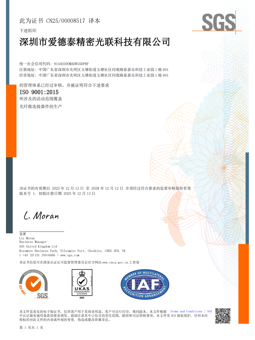 ICC訊 近日,深圳市愛德泰精密光聯(lián)科技有限公司(愛德泰光明分公司)成功通過ISO 9001:2015 質(zhì)量管理體系認(rèn)證。本次認(rèn)證由國際公認(rèn)的測試、檢驗和認(rèn)證機構(gòu)SGS嚴(yán)格審核并頒發(fā),證書覆蓋了公司核心業(yè)務(wù)——光纖微連接器件的生產(chǎn)。
