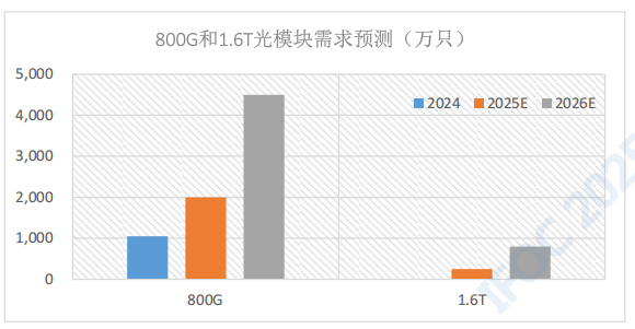 關(guān)于2026年需求方面,據(jù)IFOC2025訊石光通信大會(huì)上,ICC訊石產(chǎn)研院發(fā)布報(bào)告估測,2026年800G需求約4500萬只,相比2025年翻倍;其中,NV GPU配套約2000萬只,ASIC帶來的增量2000萬只。這一數(shù)字為明年的發(fā)展