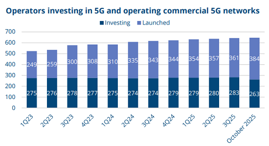 截至2025年10月底,GSA已確認全球191個國家及地區(qū)的647家運營商通過測試、頻譜獲取、規(guī)劃、部署或商用發(fā)布等方式投資5G。其中,143個市場的384家運營商已正式或試商用推出至少一項符合3GPP標準的5G服務。