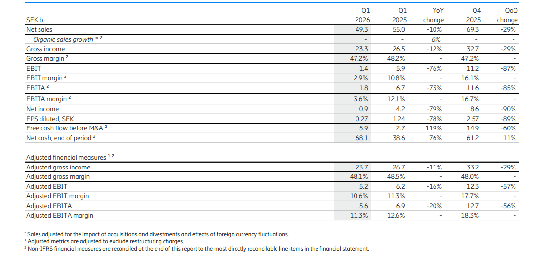 從盈利能力來看,調(diào)整后毛利率為48.1%,略低于去年同期的48.5%。調(diào)整后EBITA(息稅前利潤)為56億瑞典克朗,利潤率為11.3%,去年同期為69億瑞典克朗和12.6%。2026年一季度的凈利潤為9億瑞典克朗,去年同期為42億瑞典克朗,稀釋后每股收益為0.27瑞典克朗(去年同期1.24瑞典克朗)。