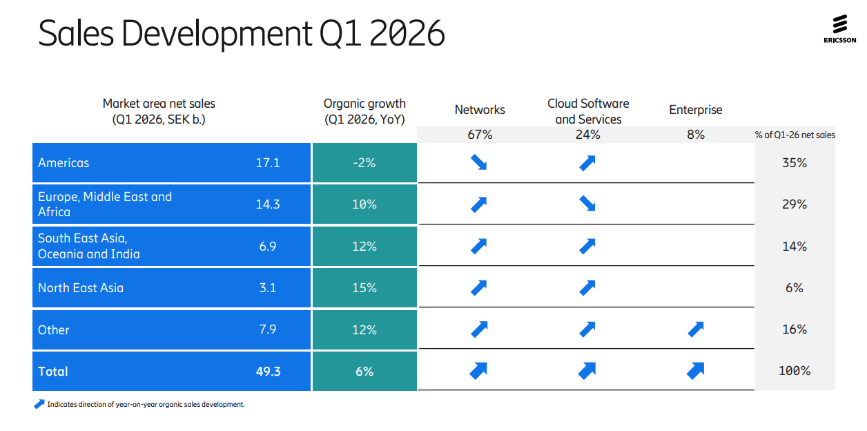 2026年一季度,愛立信銷售收入493.32億瑞典克朗,2025年一季度銷售收入為550.25億瑞典克朗,同比下滑10%,主要受約78億瑞典克朗的負(fù)面匯率影響。但剔除匯率和并購影響的有機(jī)銷售額實際增長6%。上個季度實現(xiàn)收入692.85億瑞典克朗,環(huán)比下滑29%。