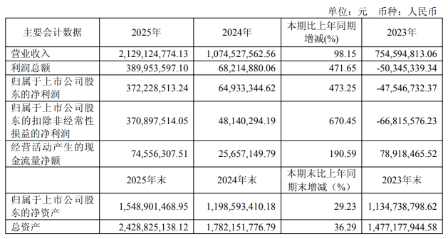 ICC訊 河南仕佳光子科技股份有限公司近日發(fā)布2025年年度報告。報告顯示,公司去年實現(xiàn)營業(yè)收入21.29億元,同比增長98.15%;歸屬于上市公司股東的凈利潤為3.72億元,同比增長473.25%;扣除非經(jīng)常性損益后的凈利潤為3.71億元,同比增長670.45%。經(jīng)營活動產(chǎn)生的現(xiàn)金流量凈額為7455.63萬元,同比增長190.59%。截至2025年末,公司總資產(chǎn)為24.29億元,較期初增長36.29%;歸屬于上市公司股東的凈資產(chǎn)為15.49億元,較期初增長29.23%。