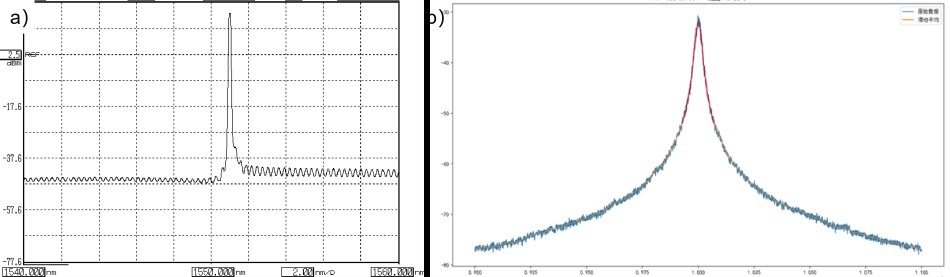 Fig 3 中科光芯 1550nm DFB器件500mA下的(a)光譜圖;(b)利用自延遲外差法獲得頻譜圖