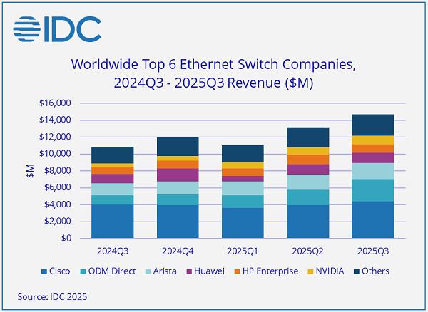 ICC訊 —— 國(guó)際數(shù)據(jù)公司(IDC)最新發(fā)布的《季度以太網(wǎng)交換機(jī)跟蹤報(bào)告》和《季度路由器跟蹤報(bào)告》顯示,2025年第三季度(3Q25),全球以太網(wǎng)交換機(jī)市場(chǎng)收入達(dá)到147億美元,較去年同期增長(zhǎng)35.2%。這一強(qiáng)勁增長(zhǎng)主要由市場(chǎng)的數(shù)據(jù)中心部分驅(qū)動(dòng),因?yàn)槌笠?guī)模企業(yè)和云服務(wù)提供商競(jìng)相為AI時(shí)代構(gòu)建基礎(chǔ)設(shè)施容量。與此同時(shí),2025年第三季度全球企業(yè)和服務(wù)提供商(SP)路由器市場(chǎng)總額同比增長(zhǎng)15.8%,達(dá)到36億美元。