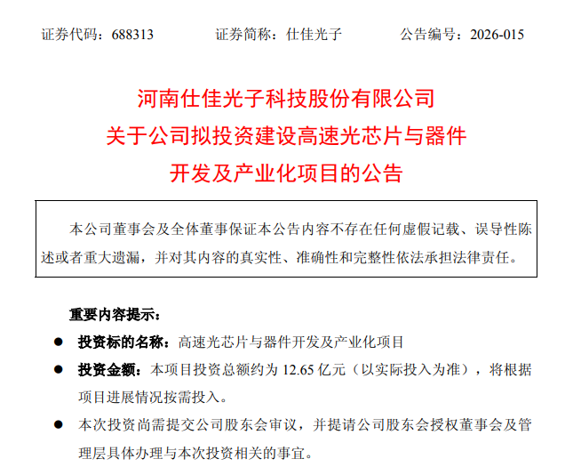 ICC訊 河南仕佳光子科技股份有限公司(以下簡稱“仕佳光子”)于2026年4月18日發(fā)布公告稱,公司擬投資建設高速光芯片與器件開發(fā)及產業(yè)化項目,項目總投資額約為12.65億元人民幣,建設周期為2年,項目實施地點位于河南省鶴壁市。