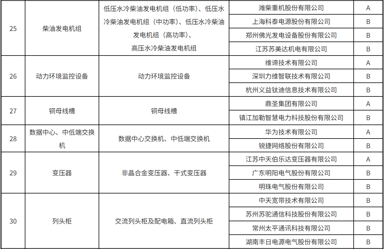 本次公示涵蓋了光纜類、光纖分纖箱/終端盒類、光纜交接箱/配線架類、光纜接頭盒、軟跳纖類、光分路器、數(shù)據(jù)線纜、基站前傳設(shè)備、數(shù)據(jù)中心/中低端交換機(jī)、智能家庭網(wǎng)關(guān)、基站天線類、機(jī)柜類等34個(gè)產(chǎn)品服務(wù)。A、B級(jí)供應(yīng)商名單具體的分級(jí)結(jié)果如下: