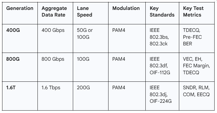 表1:信號標(biāo)準(zhǔn)的演進(jìn)過程,通道速度從400G系統(tǒng)的50或100 Gigabit發(fā)展到800G的100 Gigabit,再到1.6 Terabit系統(tǒng)的200 Gigabit,以及每代對應(yīng)的關(guān)鍵測試指標(biāo)和相關(guān)標(biāo)準(zhǔn)。