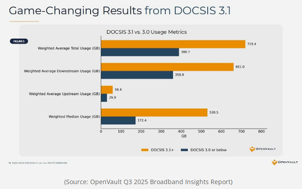 OpenVault在報告中指出:“雖然整體消費增長不再以行業(yè)周期早期所見的速度加速,但仍保持韌性。這表明平均寬帶使用量已進入一個更穩(wěn)定但仍處于擴張的階段——這與DOCSIS 3.1覆蓋范圍的擴大以及500 Mbps以上服務(wù)等級的普及相一致?!?