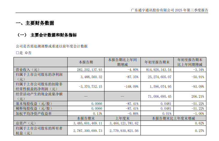 ICC訊 10月29日,通宇通訊公布2025年三季報(bào)。2025年前三季度通宇通訊營(yíng)收為8.15億元,同比下降3.3%;歸母凈利潤(rùn)為2527萬元,同比下降50.9%。其中第三季度,通宇通訊營(yíng)收為2.82億元,同比下降4.8%;歸母凈利潤(rùn)為349萬元,同比下降87.3%。