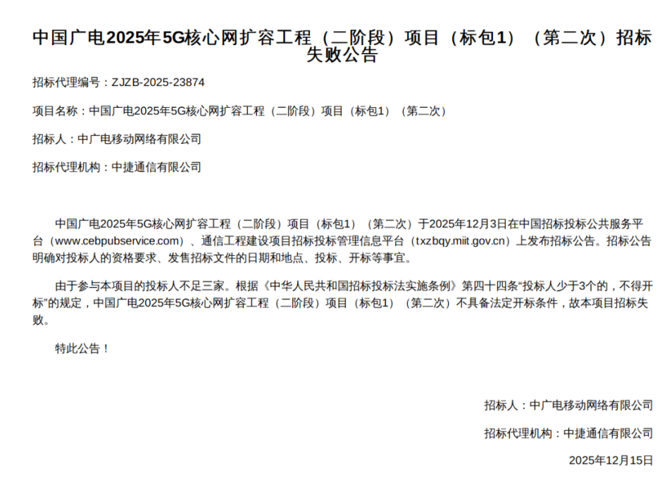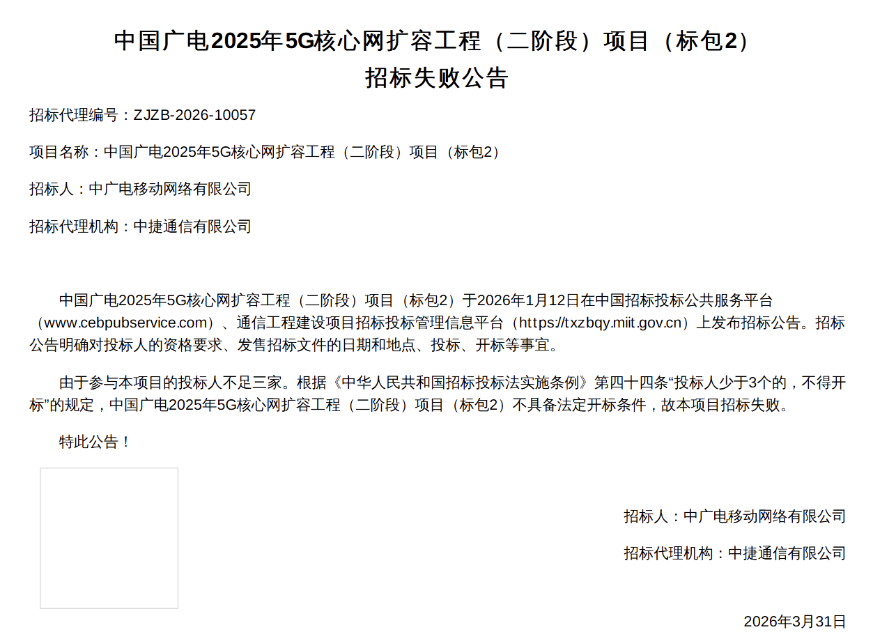 ICC訊 3月31日,中廣電移動網(wǎng)絡(luò)有限公司發(fā)布公告,宣布中國廣電2025年5G核心網(wǎng)擴容工程(二階段)”標(biāo)包2和標(biāo)包3采購失敗,原因均為參與項目的投標(biāo)人不足三家,不具備法定開標(biāo)條件。