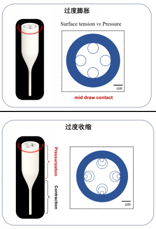 在空芯光纖的拉絲過程中,空氣孔會受到表面張力和氣體壓力的雙重作用。前半程以氣壓為主,后半程表面張力占優(yōu)。即使控制得極其謹(jǐn)慎,仍不可避免地出現(xiàn)兩種情況: