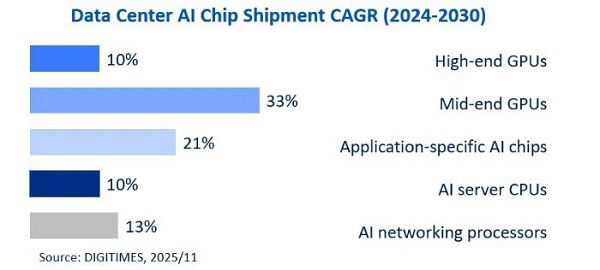 ICC訊——根據(jù)DIGITIMES Asia發(fā)布的最新報告,全球數(shù)據(jù)中心AI芯片出貨量預計將從2024年的3050萬片增長至2030年的5340萬片。此類數(shù)據(jù)中心AI芯片包括高端和中端GPU、專用AI芯片(如Google的TPU)、AI服務器CPU,以及網(wǎng)絡/互聯(lián)相關芯片(例如交換機ASIC/機架級互聯(lián)芯片/DPU和NIC)。