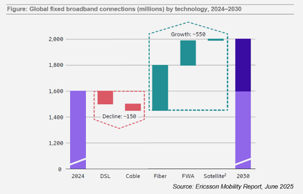 愛(ài)立信移動(dòng)報(bào)告圖表顯示,2024年至2030年全球固定寬帶連接數(shù)(包括DSL、電纜、光纖、FWA和衛(wèi)星)將凈增約4億,其中光纖、FWA和衛(wèi)星合計(jì)增長(zhǎng)約5.5億,DSL和電纜合計(jì)下降約1.5億。