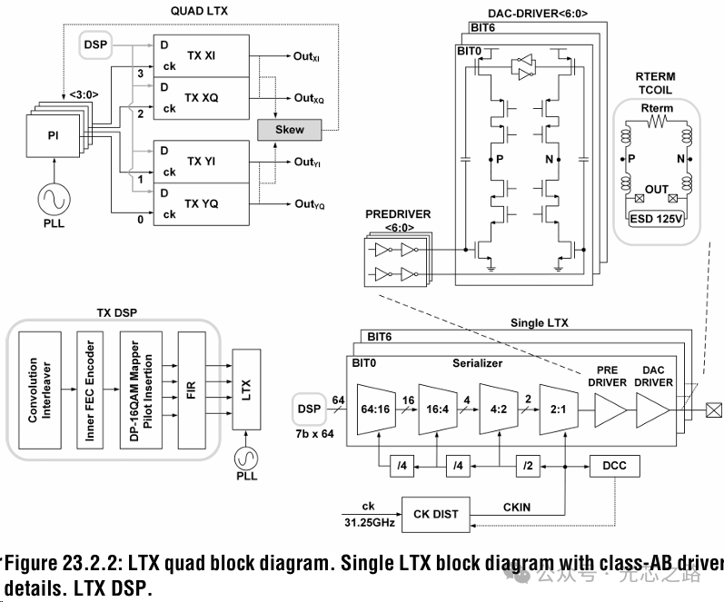 來自 DSP 的 7b × 64 數(shù)據(jù)流執(zhí)行 64:1 并串轉(zhuǎn)換,全速預(yù)驅(qū)動器將信號傳遞給基于 7b DAC驅(qū)動器,以 PAM4傳輸數(shù)據(jù)。