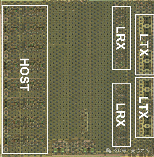 下圖展示5nm FinFET 封裝芯片。在主機(jī)側(cè),具有 8×100Gb/s 的 PAM4 發(fā)送和接收通道,在線路側(cè)具有 2×400Gb/s 的相干光通道。
