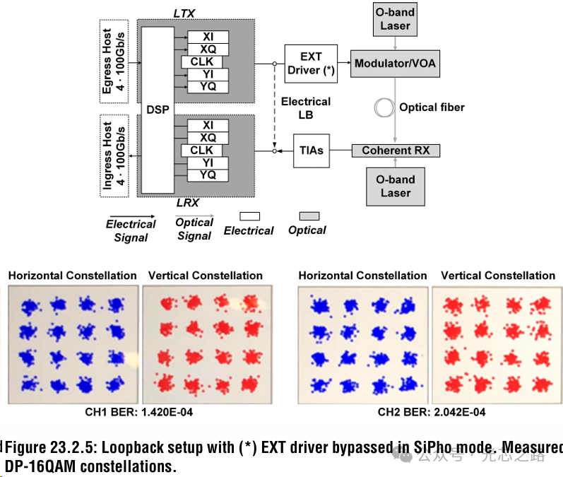 該器件采用 5nm Finfet工藝制造。一個時鐘部分(CLK)驅(qū)動四個線路發(fā)射器(LTX)或線路接收器(LRX)通道,以四線配置方式工作。DP-16QAM 的調(diào)制和解調(diào)均在光域內(nèi)完成,基于高度集成的硅光器件。在 LRX 路徑中,外部跨阻放大器(TIAs)提供低噪聲放大并最大限度地提高接收機(jī)靈敏度。