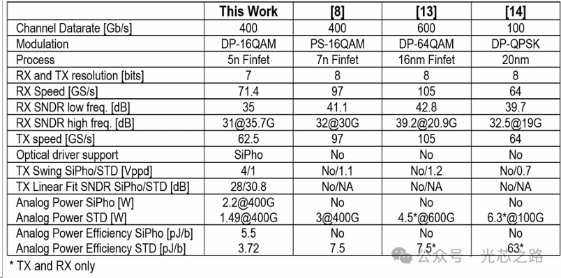 與采用相干技術(shù)的最新完整收發(fā)器的比較。所提出的相干-lite 收發(fā)器的模擬功效是目前最先進(jìn)的傳統(tǒng)相干系統(tǒng)的2倍,是首個能夠?qū)崿F(xiàn)與硅光 MZM 相兼容的大擺幅驅(qū)動器集成的器件。