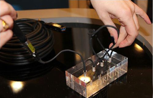 在美國(guó)三藩市Moscone Center West 舉行的Macworld/iWorld 2013展會(huì)上,康寧(Corning)公司帶來(lái)了他們最新的Thunderbolt 和USB 3.0 光纖線材產(chǎn)品,長(zhǎng)度范圍從幾米到最長(zhǎng)100米。連接器接頭部分包含一個(gè)小的轉(zhuǎn)換器,可以把從Thunderbolt或者USB端口傳輸進(jìn)來(lái)的數(shù)字信號(hào)轉(zhuǎn)換成光纖信號(hào)發(fā)送到線材的另一端,再轉(zhuǎn)換回?cái)?shù)字信號(hào)。