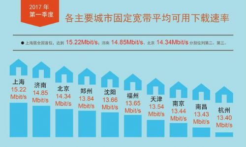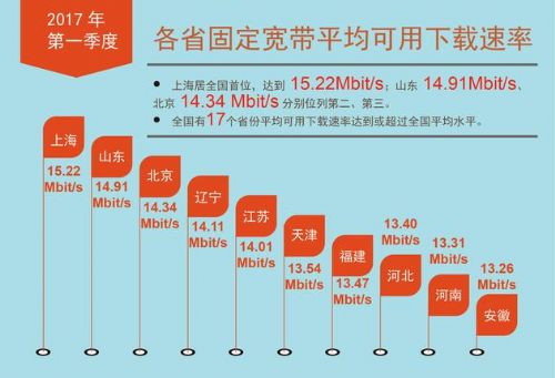 根據(jù)本次報(bào)告,從區(qū)域情況看,全國(guó)已有25個(gè)省級(jí)行政區(qū)域固定寬帶平均下載速率超過12Mbit/s,17個(gè)超過了13Mbit/s;上海、山東、北京、遼寧、江蘇排在前五位。在直轄市和省會(huì)城市固定寬帶下載速率排行榜上,上海、濟(jì)南、北京、鄭州、沈陽(yáng)位居前五位。從不同運(yùn)營(yíng)企業(yè)的移動(dòng)寬帶網(wǎng)速狀況看,3G網(wǎng)絡(luò)用戶下載速率和4G網(wǎng)絡(luò)用戶下載速率中國(guó)聯(lián)通均最高,分別達(dá)到4.50 Mbit/s和14.17 Mbit/s。