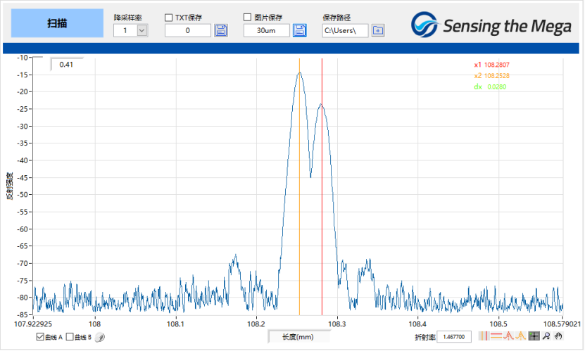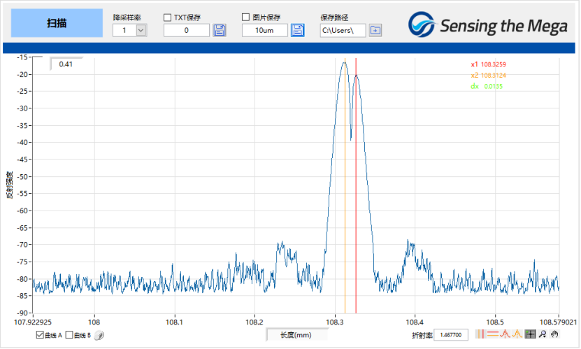 從以上結(jié)果可以看出,在數(shù)十um的距離情況下,OLI可以明顯分辨相鄰兩個反射事件點(對應兩個事件點反射峰),且本次實驗案例中,兩個光纖反射端面間隙是空氣,空氣對光的折射率比光纖要更低,如果對應測量光纖中某兩個事件點的距離,則設備分辨的極限距離將更小。
