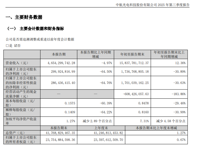 ICC訊 中航光電10月30日披露2025年第三季度報(bào)告。2025年前三季度中航光電實(shí)現(xiàn)營(yíng)收158.38億元,同比增長(zhǎng)12.36%;歸母凈利潤(rùn)17.37億元,同比下降30.89%,基本每股收益0.8478元,同比下降29.46%。其中,2025年第三季度中航光電實(shí)現(xiàn)營(yíng)收46.54億元,同比下滑4.97%,歸母凈利潤(rùn)為2.99億元,同比下滑64.5%。