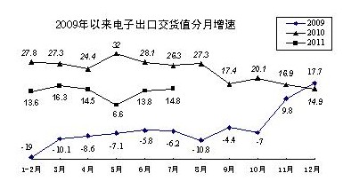 出口增勢(shì)低位回穩(wěn)。1-7月,電子制造業(yè)出口交貨值20898億元,同比增長14.4%,占全部規(guī)模以上工業(yè)出口比重的37.4%,占本行業(yè)銷售產(chǎn)值比重的62.2%。受去年同期基數(shù)較高以及日本地震海嘯災(zāi)害對(duì)產(chǎn)業(yè)供應(yīng)鏈影響,5月份出口交貨值增速一度下滑到6.6%,6、7兩個(gè)月分別回升到13.8%和14.8%。