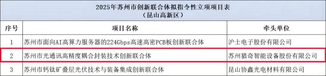 ICC訊 近日,蘇州市科技局對2025年度蘇州市創(chuàng)新聯(lián)合體立項項目進行公示,蘇州獵奇智能設(shè)備股份有限公司成功入選蘇州市創(chuàng)新聯(lián)合體指令性立項項目。